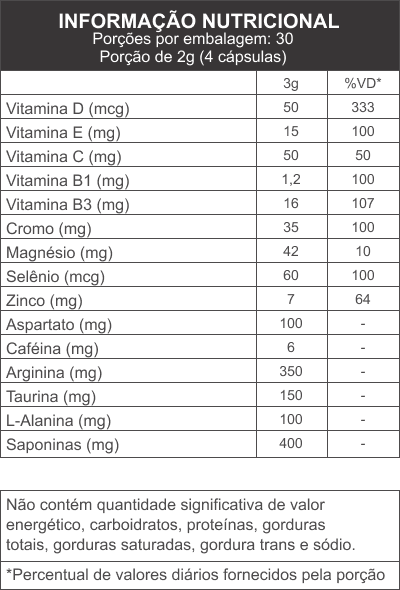 Este produto não é um medicamento. Não exceder a recomendação diária de consumo indicada na embalagem. Mantenha fora do alcance de crianças. Este produto não deve ser consumido por gestantes, lactantes e crianças. Após aberto consumir em até 60 dias.
