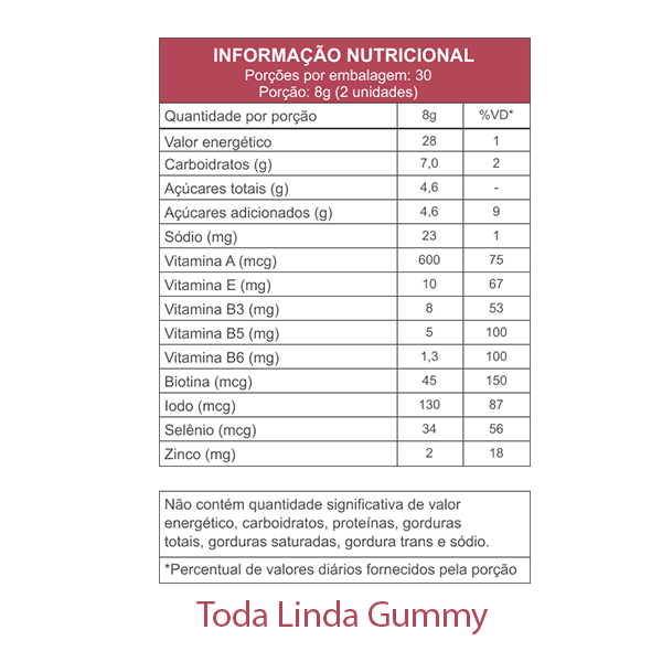 Açúcar, xarope de glicose, vitamina E (acetato de DL-alfa tocoferol), vitamina A (palmitato de retinila), vitamina B3 (nicotinamida), zinco (bisglicinato de zinco), vitamina B5 (D-pantotenato de cálcio), selênio (L-selenometionina), vitamina B6 (cloridrato de piridoxina), iodo (iodeto de potássio), vitamina B7 (D-biotina), gelificante pectina, estabilizante maltitol, acidulante ácido cítrico, regulador de acidez citrato de sódio, aromatizante, glaceante cera de carnaúba, corante artificial eritrosina.