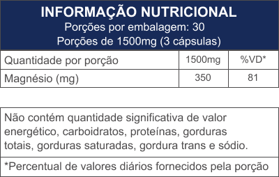 Dimagnésio malato. Antiumectante: dióxido de silício. Excipiente: amido de milho. Composição da cápsula: gelatina e umectante glicerina.